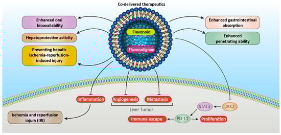 Renault-Mahieux et al. proposed the idea of co-encapsulating fisetin and cisplatin into liposomes to combine the antiangiogenic properties of fisetin with the cytotoxic properties of cisplatin. Based on the results, the fisetin antiangiogenic properties remained intact, encapsulated cisplatin and fisetin affected glioblastoma (GBM) cells, and fisetin impacted GBM U87-MG cells. In other words, the co-loaded formulation exhibited effective anti-GBM cell activity and could keep fisetin effects long-lasting []. In addition, Altamimi et al. reviewed the efficacy of transdermal elastic liposomes (LEL1-LEL12) loaded with luteolin (LUT) to prevent breast cancer in vitro and ex vivo. The drug-loaded carrier (OLEL1) displayed concentration-dependent inhibition of MCF-7 cells compared to the free drug and the elastic liposome improved cellular internalization for maximum inhibition, resulting in establishing a potential strategy of elastic liposomes for improving LUT transdermal administration and increasing therapeutic effectiveness in breast cancer treatment []. Further, Deshmukh et al. created chrysin liposomes (CLPs) using the chitosan/lecithin/electrostatic deposition assisted film hydration approach to protect chrysin in the nano-lipoidal shell. A more than five-fold increase in chrysin liposome bioavailability was observed in in vivo pharmacokinetic research. In silico molecular docking studies of the same combination reported electrostatic interaction between the two polymers, indicating that chitosan might shield and enclose chrysin, resulting in increasing its cytotoxicity and bioavailability in the process []. Furthermore, Huang et al. created a liposomal chrysin (LC) and discussed its effects on hepatic ischemia-reperfusion (HIR) and potential mechanisms. The results indicated that LC benefits from promising biocompatibility and is considered as an effective medication for treating and preventing HIR-induced injury []. In another study, Tian et al. prepared PSMA-specific antibodies co-encapsulated in liposomes with genistein and plumbagin to target prostate cancer cells. The above-mentioned liposomes reduced the development of PSMA-expressing prostate cancer cells by more than 90% without harming healthy cells or human red blood cells. Overall, encapsulating other treatments utilizing the same method can create non-toxic and PSMA-specific antibody linked liposomes such as the drugs genistein and plumbagin to improve various cancer treatments and stop their spread [].