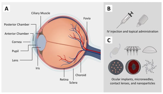 Schematic representation of different sections of the human eye (A), conventional drug delivery techniques (B), and novel drug delivery techniques (C).