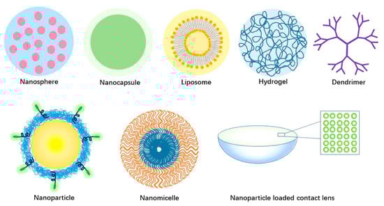 The term nanocarrier is a broad term that is used to describe exceptionally small (10–1000 nm) particles that can transport a therapeutic drug at a specific site and then act as a drug depot, thus enabling continuous drug delivery [104,105]. Due to their small size, nanocarriers offer many advantages. For instance, nanocarriers can travel through the endothelium in inflammatory sites or epithelium and, more notably, can efficiently be drawn into several different cell types for selective drug accumulation at target sites [104,106]. Additionally, the use of nanocarriers in liquid or semisolid formulations has been shown to prolong the residence time of ophthalmic drugs [9]. The surface charge of nanocarriers, measured as zeta potential, also plays a role in cellular uptake and in drug release. Nanocarriers have broad applications, including the encapsulation of anticancer agents to control metastasis, and have gained attention for their ability to modulate various physiological or pathological processes [107,108,109]. Among the many novel injectable nanocarriers that have been developed, including nanospheres, nanocapsules, and nanosuspensions, hydrogels, liposomes, nanomicelles, DNA-inspired materials, and dendrimers are discussed in the context of prominent ocular diseases. Figure 2 shows a schematic of some of the nanocarriers used for ocular drug delivery [110].