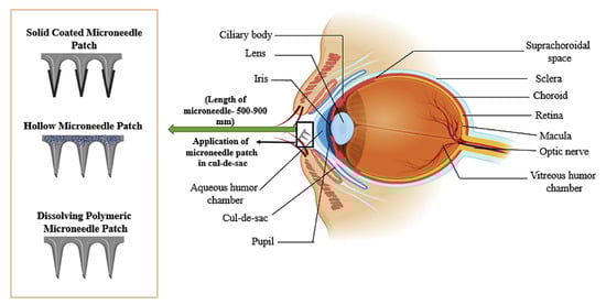- Gupta, P.; Yadav, K.S. Applications of Microneedles in Delivering Drugs for Various Ocular Diseases. Life Sci. 2019, 237, 116907. [Google Scholar] [CrossRef]