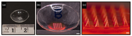 Digital photograph of a dissolvable polymeric microneedle patch supported by a convex polymer (a), stereomicroscopic image with a scale bar of 1 mm (b), and a magnified stereomicroscopic image with scale bar of 200 µm (c). Figure 7 was reproduced from Roy et al. [164] with permission.