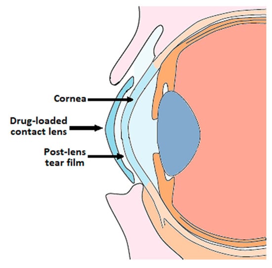 Placement of a drug-loaded contact lens on the cornea for ocular drug delivery. Image reproduced from Franco et al. [166] under the Creative Commons Attribution 4.0 International License (CC BY 4.0).