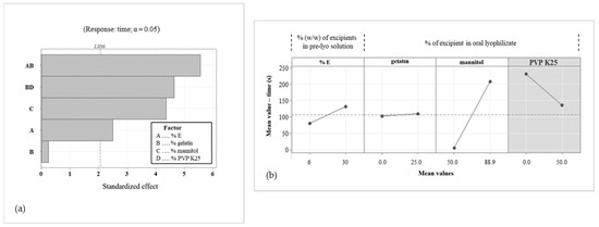 Pareto chart showing influence of formulation composition on redispersion time (a) and factorial graph showing influence of factors on disintegration time (Minitab®) (b).