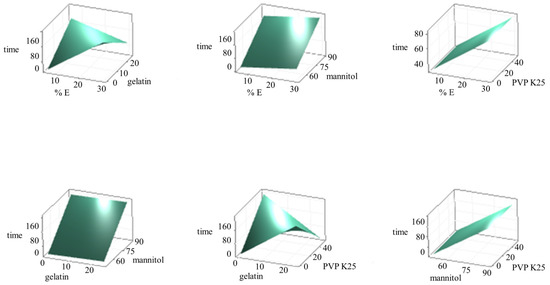 The program Minitab® was not able to assess the impact of PVP K25 alone; therefore, it was not included in the Pareto chart. Obtained results revealed that interaction “% E*gelatin” has the greatest influence on the disintegration time of OLs, followed by interaction “gelatin*PVP K25”, effect of “mannitol”, effect of “% E” and far below the standardized effect, the minor effect of “gelatin”. The factorial graph (Figure 4b) shows that a higher total amount of excipients as well as an increase in mannitol concentration in the formulation significantly contribute to the prolongation of the disintegration time, while the gelatin impact is not strongly pronounced. During the laboratory experimental part, an opposite trend was observed for PVP K25, but as its effect was not recognized as significant (p > 0.05), PVP K25 was not included in the model. Nevertheless, it was found out that due to the excessive fragility of OLs with only PVP K25, gelatin has to be added. Gelatin is also very important for the incorporation of olanzapine, which is a very poorly water-soluble drug. By constructing surface diagrams, it is possible to evaluate the simultaneous influence of two factors while the others remain constant. As a factorial graph, surface diagrams on Figure 5 clearly show that increasing the total amount of excipients prolongs the OL’s disintegration time, which was in line with our expectations. The interactions “% E*mannitol”, “gelatin*mannitol”, and “mannitol*PVP K25” did not have a significant effect on the disintegration time and did not prevail over the influence of mannitol itself (Figure 5). In the case of the “% E*PVP K25” interactions, it can be concluded that the addition of PVP K25 to the formulation allows a shorter disintegration time to be achieved compared with a formulation without PVP K25, while additional variations in the amount of PVP K25 did not alter the disintegration time of OLs. An interesting effect was observed for interactions “% E*gelatin” and “gelatin*PVP K25”.