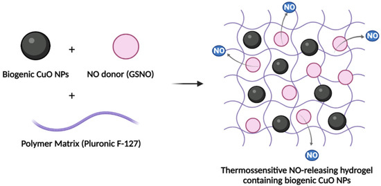 Indeed, the potential of various types of nanomaterials has been also widely reported in almost every area of science. The broad range of its applications for medicine arises from its biomedical properties, making them suitable as antitumor and anticancer agents [20]. Particularly, metal nanoparticles or metal oxide nanoparticles have been largely explored in cancer therapy with promising results [20]. In particular, we have demonstrated that the combination of NO donor and metal-based NPs incorporated into biomaterials (such as polymeric films or hydrogels) can enhance toxicity against cancer cells [21,22]. Thus, the combination of metal-based NPs and NO donors in a biomaterial, such as a hydrogel, is a promising approach for localized and enhanced toxicity against cancer cells, with minimum side effects.