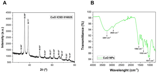 The crystalline structure of the CuO NPs is shown in Figure 2A. The resulting diffractogram shows a monoclinic structure of green-tea-synthesized CuO NPs, with peaks at 2θ (°) = 32.60, 35.59, 38.71, 48.93, 53.53, 58.27, 61.65, 66.42, 68.14, 72.52, and 75.10, corresponding to the ICSD number 016025. The crystallite size of the CuO NPs was calculated using Equation (1) and it was found to be 33.31 nm.
