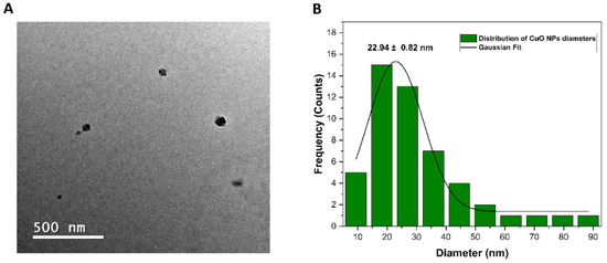 CuO NP images were obtained using a Carl Zeiss LIBRA® 120 transmission electron microscope (Zeiss International, Jena, Germany) operated at 80 kV. The sample was dispersed in isopropanol and submitted to an ultrasound bath for about 10 min. Then, a drop of this dispersion was deposited on a carbon grid. After solvent evaporation, the grid was placed in the desiccator and dried under vacuum for about 2 h. The average size of the nanoparticles in the solid state was determined using ImageJ software.