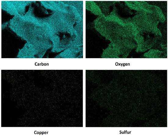 The morphology of lyophilized PL + CuO NPs + GSNO hydrogel was examined with a field emission scanning electron microscope Quanta 250 (FEI Co, Hillsboro, OR, USA), equipped with an Oxford X-MAX50 energy-dispersive spectrometer (Oxford, UK), operated at 20 kV with a STEM (scanning transmission electron microscopy) detector. The dried samples were individually spread on double-sided conductive tape, placed in a metal stub, and then analyzed. The EDS technique was used to qualitatively map the distribution of carbon (C), oxygen (O), copper (Cu), and sulfur (S) atoms.
