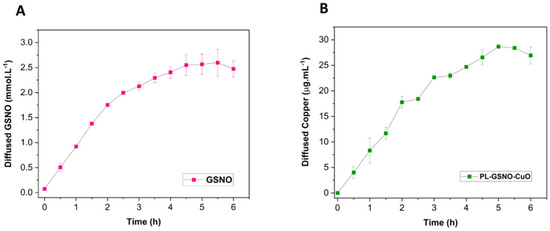 The diffusion of intact GSNO and Cu from PL + CuO NPs + GSNO hydrogel was monitored using the Franz diffusion cell, as shown in Figure 5 [21,22]. The diffusion profile of intact GSNO molecules from the hydrogel shows an initial burst in the first 2 h of monitoring, followed by a steady-state GSNO diffusion (Figure 5A). Indeed, the diffusion rate for GSNO in the first 2 h was found to be 0.83 mM·h−1, and from 2.5 to 6 h, it was 0.15 mM·h−1. By calculating the area under the curve, the total amount of GSNO diffused from the hydrogel was 11.19 mM, after 6 h of monitoring. Copper presents a similar diffusion profile, compared to GSNO (Figure 5B). In the first 2 h of monitoring, the diffusion rate for copper was 8.64 µg·mL−1·h−1 and then it became 2.81 µg·mL−1·h−1 from 2.5 to 6 h. The total amount of copper released during 6 h of monitoring was 113.79 µg·mL−1. Similar results were reported for GSNO diffusion from polymeric hydrogels [22]. Thus, these results indicate that PL hydrogel can promote a sustained diffusion of both GSNO and copper. Yet, PL hydrogel is able to release both the intact GSNO molecule and copper in a similar fashion.