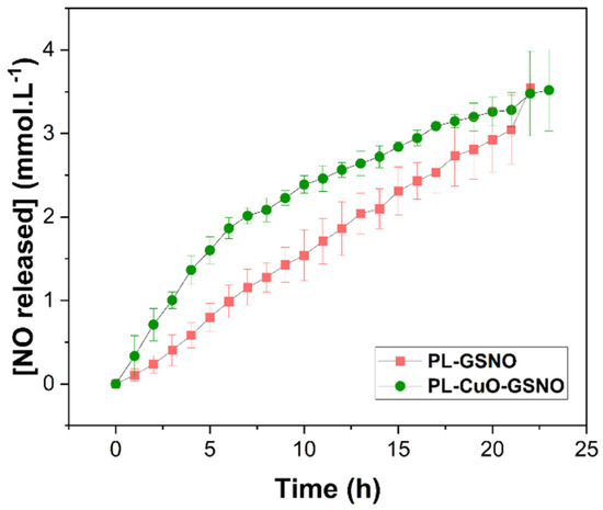 As can be observed, both hydrogels released NO in a sustained manner, for at least 24 h. The PL + GSNO hydrogel released a total amount of approximately 3.5 mM of NO. Although there was no difference in the total amount of NO release, the addition of CuO NPs changed the NO release profile, where the hydrogel without CuO NPs had a linear profile, while the hydrogel containing CuO NPs increased linearly until 5 h and then slowed down before reaching a plateau. Particularly, at the beginning of the monitoring, there was a 2-fold increase in the initial rates of NO release with the addition of CuO NPs, from 0.14 ± 0.009 mM·h−1 to 0.34 ± 0.01 mM·h−1.