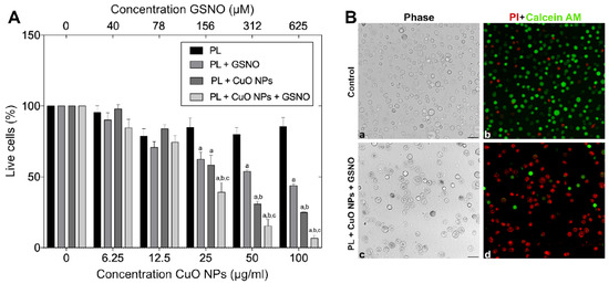 To further evaluate the efficacy of PL in combination with both CuO NPs and GSNO, a live/dead staining assay was conducted after treatment. Briefly, cells were treated with the top concentration of PL + CuO NPs + GSNO for 24 h, thus corresponding to 2.5 mg·mL−1, 100 µg·mL−1, and 625 µM of PL, CuO NPs, and GSNO, respectively. After treatment, cells were washed and stained with a live/dead kit assay (Sigma-Aldrich, Burlington, MA, USA) for 15 min according to the manufacturer’s instructions. Images were acquired with a fluorescence microscope (Nikon, Tokyo, Japan) and processed by ImageJ software [21].