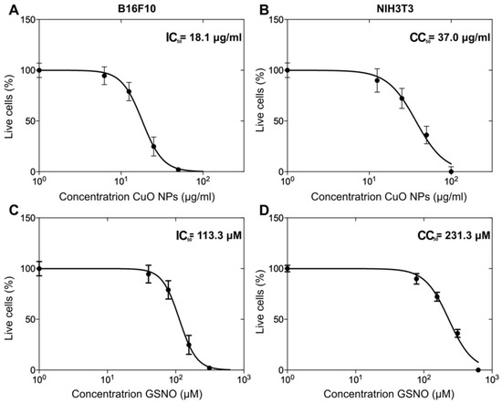 By using sigmoidal regression analysis, we calculated the IC50 value of 18.1 μg.mL−1 for CuO NPs and 113.3 μM for GSNO when melanoma cells were treated at different concentrations of PL + CuO NPs + GSNO (Figure 8A,C). Moreover, the cytotoxicity assay of PL hydrogel containing GSNO and CuO NPs was conducted to determine the effects of this drug on healthy skin cells (NIH3T3). Interestingly, the cytotoxic concentration (CC50) of both GSNO and CuO NPs against fibroblasts was 2-fold higher than that obtained for cancer cells, thus resulting in a concentration of 37 μg·mL−1 and 231.3 μM for CuO NPs and GSNO, respectively (Figure 8B,D). This resulted in a selectivity index (SI) of nearly 2, meaning that PL + CuO NPs + GSNO had greater activity toward cancer cells than healthy cells. SI was determined according to Equation (5) [30].