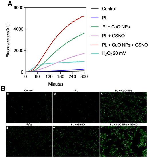 These results were further confirmed using fluorescence microscopy, which showed that the levels of ROS were substantially higher in the cells treated with PL + GSNO, PL + CuO, and PL + CuO NPs + GSNO, represented by the greater intensity of green fluorescence in those cells when compared to the other controls (untreated, PL, and H2O2) (Figure 9B).