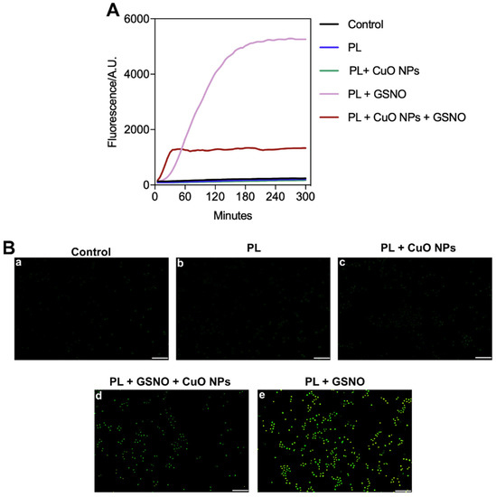 In terms of NO production, low amounts of NO were detected in the untreated control and the cells treated with PL and PL + CuO NPs (Figure 10A,B(a–c)). In contrast, NO levels were substantially enhanced (by 6.2-fold) when treated with PL + CuO NPs + GSNO in the first 30 min after incubation. After 1 h, the levels of NO reached a steady state, which was sustained for at least 5 h post-treatment. Remarkably, the levels of NO were tremendously improved by the treatment with PL + GSNO, achieving values nearly 19-fold higher than the control after 3 h of incubation, which was also sustained for at least 5 h (Figure 10A). We also demonstrated that in both groups containing GSNO, the green fluorescence intensity was significantly higher than that shown in the other groups, thus suggesting the treatment produced great amounts of NO within the cells in a very short period (Figure 10B(d,e).