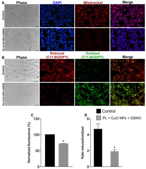 Moreover, there was a significant increase in lipid peroxidation on treated cells, as indicated by the high intensity of green fluorescence. As shown in Figure 11B, treated cells presented huge amounts of oxidized lipids as opposed to the fewer number of reduced lipids (represented by the low intensity in red fluorescence). The ratio between reduced/oxidized lipids was tremendously reduced (by nearly 40%), thus suggesting PL + CuO NPs + GSNO also produced a significant effect on the lipid metabolism of tumor cells (Figure 11D).