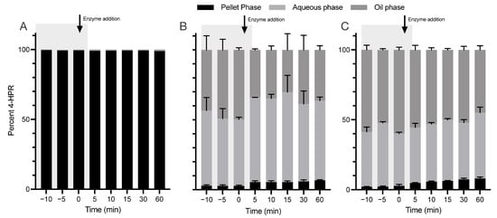 To explore whether the developed self-emulsifying lipid-based formulations were able to retain drug solubilization during dispersion and subsequent digestion in the gastrointestinal tract, formulations were evaluated using an established in vitro model of lipid digestion [36], with samples assayed using the HPLC method (Section 2.5) [36,37,38]. The distribution of 4-HPR in the oil, aqueous and pellet phases of formulations N23, N25 and HC was analysed over time (see Figure 2). The HC (clinical) formulation was marked by virtually complete drug precipitation upon dispersion, whereas N23 and N25 both showed significant 4-HPR solubilisation after dispersion and markedly lower precipitation.
