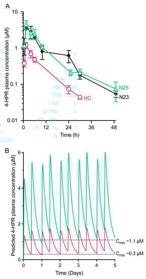 Simulated exposure profiles for a twice-daily oral dosage of 4-HPR at 20 mg/kg in mice (as administered in Fraser et al. [19]) were modelled, revealing for the first time that the minimum plasma concentration for MDE under this dosage regime was approximately 1.0 μM (Figure 1B). At the same dose level, the HC formulation appeared to achieve therapeutic concentrations for a portion of the timescale in the model but showed a significantly lower trough concentration of approximately 0.3–0.4 μM.
