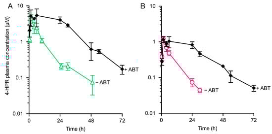CYP inhibition by ABT enhances 4-HPR plasma exposure after oral dosage. Mice were dosed with 20 mg/kg 4-HPR in either formulation N25 (A) or HC (B), with and without concurrent ABT treatment at 50 mg/kg b.i.d. Data represent the mean ± SD of n = 3 mice per time point for the plasma concentration versus time.