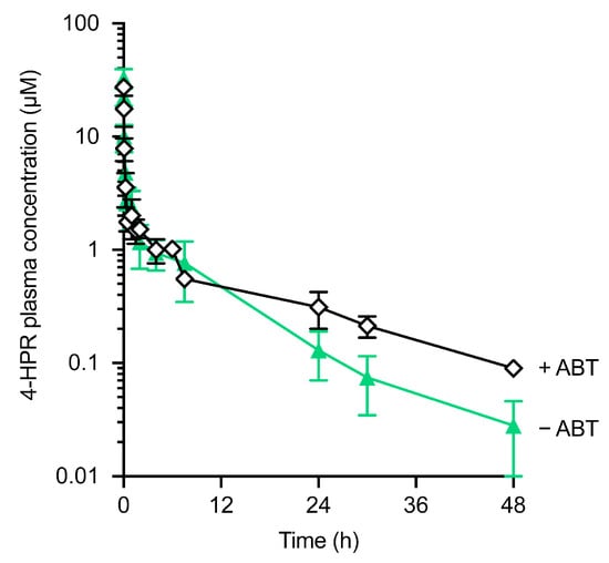 CYP inhibition by ABT only enhances 4-HPR plasma exposure to a small extent after IV dosage. Mice were dosed with 2 mg/kg 4-HPR IV via bolus tail vein injection (2 mL/kg), with and without concurrent ABT treatment at 50 mg/kg b.i.d. 4-HPR was administered and dissolved in a non-aqueous organic vehicle consisting of 10% DMSO and 90% PEG400. Data represent the mean ± SD of n = 6 mice per time point.