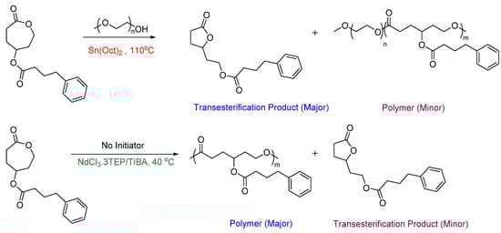 Most ROP strategies have focused on polymerizing unsubstituted CL monomers rather than substituted ones. However, a catalytic system that can effectively polymerize both substituted and unsubstituted ε-CL monomers is desirable for practical applications. Rare earth metal catalysts have been gaining attention recently due to their high reactivity, nontoxic nature, and mild reaction conditions [,,,,]. In particular, Neodymium (Nd) complexes containing ligands such as—alkoxides, phenolates, and iminophosphoranes have exhibited excellent catalytic activity in the ROP of cyclic esters [,,]. Using this catalytic system, the transesterification of PCL can be reduced by the incorporation of bulky ligands into the metal center []. Stefan et al. used an Nd catalytic system to polymerize ester-functionalized CL monomers. Here, they studied the catalytic activity of a newly developed Nd-based catalytic system, NdCl3·3TEP/TIBA (TEP = triethyl phosphate, TIBA = triisobutylaluminum), to polymerize γ-4-phenylbutyrate-CL, a prodrug monomer and compared it with the traditional Sn(Oct)2 catalytic system. They observed a relatively higher conversion rate of the monomer leading to higher molecular weight and relatively lower transesterification when compared to the polymer synthesized with tin catalyst (Figure 3) [].