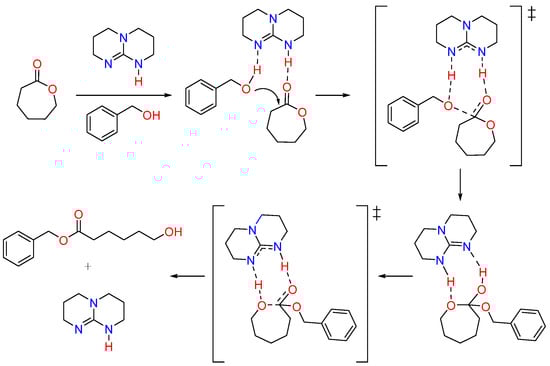TBD is recognized as one of the highly efficient organocatalysts for the ROP of cyclic esters due to its strong basicity [,]. TBD as a catalyst for the ROP of CL monomers was first investigated by Hedrick, Waymouth, et al. and was shown to produce PCL with narrow dispersity [,]. TBD exhibits a bifunctional catalytic mechanism, facilitating the activation of the monomer and the initiator through hydrogen bonding interactions. TBD activates the carbonyl group of CL monomer by donating a hydrogen bond, making it more susceptible to nucleophilic attack by the alcohol. Simultaneously, TBD activates the alcohol by accepting a hydrogen bond to its imine-like nitrogen. TBD then facilitates the ring-opening process by hydrogen bonding to the former carbonyl oxygen in the tetrahedral intermediate and transferring the hydrogen from the alcohol to the ring oxygen adjacent to the former carbonyl group (Figure 4) [].