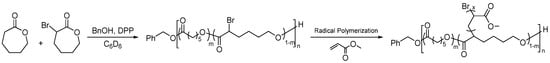 As halogens are amenable to ROP conditions, halogen-functionalized PCLs can be easily synthesized by the ROP of halogen-functionalized CL monomers. Halogen-functionalized CL offers versatility in its applications, serving as both a monomer for ROP and an initiator for atom transfer radical polymerization (ATRP) [,]. Bexis et al. demonstrated the potential of this approach by synthesizing a range of bromine (Br) substituted PCL-based graft copolymers (Figure 6). They achieved this by utilizing Cu(0) as a catalyst to polymerize methyl acrylate (MA) with Poly(α-Br-CL) homopolymer and Poly(α-Br-CL-co-ε-CL) copolymers as macroinitiators. Notably, this process produced polymers with low dispersity (Đ ≤ 1.22) and unique macromolecular topologies and was conducted under mild reaction conditions. Employing poly halogen-functionalized ε-CLs as macroinitiators make it possible to generate living grafted polymers with a degradable poly(ε-CL) backbone in a controlled manner [].