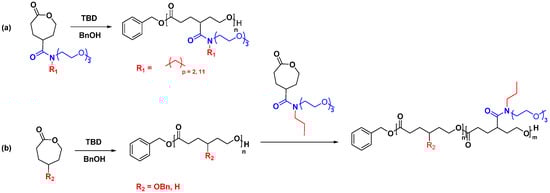 Amide functionalized PCL, an area explored recently, has excellent potential to develop advanced materials for drug delivery applications with minimal effort. One of the significant advantages of amide linkage is that it can accommodate two functional groups, which doubles the grafting density of the functional group per monomer []. For example, Stefan et al. reported TBD-catalyzed ROP of γ-amide functionalized ε-CL monomers. Their work demonstrated that TBD could initiate the synthesis of amphiphilic homopolymers as well as amphiphilic block copolymers (Figure 7) [,].