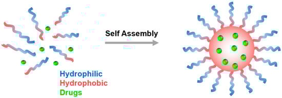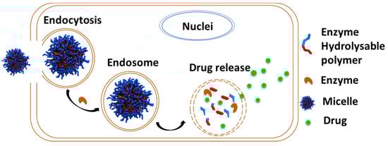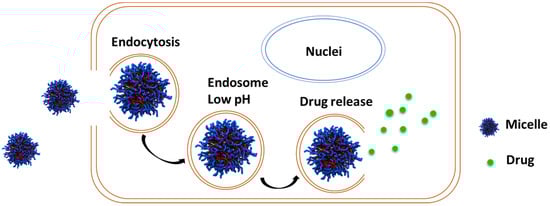 Polymeric micelles formed by the self-assembly of amphiphilic block copolymers of PCLs can be used as drug delivery vehicles. These amphiphilic block copolymers are composed of a hydrophilic and a hydrophobic segment which can self-assemble in aqueous media to form micelles with a hydrophobic core and a hydrophilic shell. Hydrophobic drug molecules can be encapsulated within the hydrophobic core of the micelle (Figure 9). The hydrophilic shell can provide enhanced solubility for the micelle and its cargo; it also shields against opsonization and helps the particles stealthily circulate in the bloodstream [,,,,,,]. Moreover, the hydrophilic shell can be modified by attaching targeting ligands and markers that can aid the particles in selectively interacting with specific diseased cells. Polymeric micelles, ranging from 10–100 nm, remain “stealthy” by avoiding kidney-mediated excretion and bypassing spleen filtration [,]. Moreover, the nanosize allows them to take advantage of passive targeting through the EPR effect and is amenable to active targeting [,].