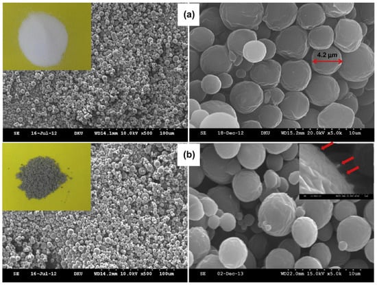 Scanning electron micrographs of (a) pure PCL microspheres and (b) w-CNT/taxol-containing PCL microspheres (PCTx-1). In the insets: (i) photos of pure PCL microspheres (the left upper inset, white color) and of w-CNT/taxol-containing PCL microspheres (the left lower inset, gray); (ii) the red arrows indicate projected portions of w-CNTs (the right lower inset) [] (Printed with permission from Elsevier©).