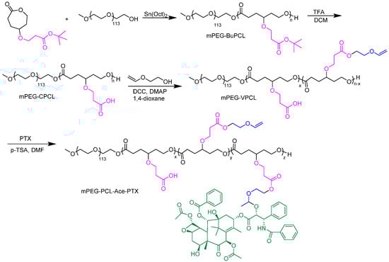 - Zhai, Y.; Zhou, X.; Jia, L.; Ma, C.; Song, R.; Deng, Y.; Hu, X.; Sun, W. Acetal-linked paclitaxel polymeric prodrug based on functionalized mPEG-PCL diblock polymer for pH-triggered drug delivery. Polymers 2017, 9, 698. [Google Scholar] [CrossRef] [PubMed]
