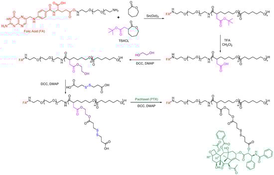 Functionalized PCL has also been studied recently for active targeting. For example, Rezaei group developed a polymer-drug conjugate that can effectively deliver PTX to target cells []. They used a PEG-b-PCL-based amphiphilic block copolymer scaffold with functional disulfide linkages, which was prepared using a controlled ring-opening polymerization method with modifications (Figure 13). PTX was chemically linked to this scaffold through a DCC-catalyzed esterification reaction. The folate-poly(ethylene glycol)-b-poly((α-paclitaxel-SS-caprolactone)-co-caprolactone) (FA-PEG-b-P((PTXSS-CL)-co-CL)) micelles conjugates exhibited apparent targetability to folate receptor-overexpressing HeLa cells. The resulting FA-PEG-b-P((PTX-SS-CL)-co-CL) micelles were stable, had a narrow size, and had a low CMC value of 5.21 mg L−1. The micelles showed high intracellular uptake and drug release in the tumor intracellular environment, leading to improved cytotoxicity compared to free PTX.