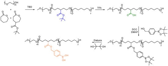 In 2015, Tang et al. utilized PTX-functionalized PCL to passively target cancer sites []. The PTX-PCL conjugate displayed slightly higher drug efficacy than free PTX in MCF-7 cells after 72 hrs of incubation at concentrations between 0.31 and 5.76 mg PTX equiv·mL−1. In another study, Yin et al. used TBD to prepare ester-functionalized PCL block copolymers, specifically with conjugated phenylboronic acid (PBA) formate pendant group (Figure 14) []. Incorporating the PBA pendant group significantly increased the interaction between the polymeric carriers and DOX. Consequently, the drug-loading capacity of the micelles was increased with the use of PBA-modified PCL block copolymers with an encapsulation efficiency of over 95%. These micelles have also been observed to maintain a consistent particle size for up to a week, which makes them a reliable drug carrier.