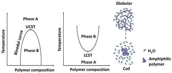 Materials with thermal properties can be tailor-made so that their incorporation in amphiphilic polymers intended for drug delivery can retain the integrity of the DDS at a certain temperature range but release the loaded drug at another range of temperature. These materials are generally known to be thermo-responsive. Thermo-responsive polymers reported as DDS are known to undergo phase transition between a hydrated state and a dehydrated state above or below their critical solution temperature (CST) [], as represented in Figure 16. These thermo-responsive polymers become globular in a hydrated state and coil-like once dehydrated [,,]. The temperature above which thermo-responsive polymers are insoluble in aqueous solution is termed lower critical solution temperature (LCST) and is often determined as the temperature at which there is a 50% drop in the transmittance as the polymer solution is heated [,,,]. The temperature below which thermo-responsive polymer transitions from coil-to-globular shape is also known as upper critical solution temperature (UCST). The application of such a concept has found application in DDS where the DDS remains intact (drugs are not released) at physiological temperature (37 °C) but rapidly releases the loaded drug by either raising the temperature (in polymers with LCST) or reducing the temperature (in polymer with UCST) at the local area where the drug is intended to be released [,,,,].