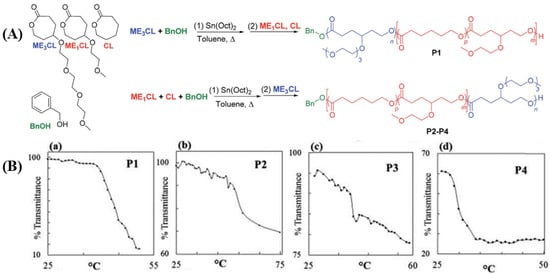 (A) Synthesis of thermo-responsive PCL with varying content of ME3 unit. (B) The LCST of the polymer decreases as we go from P1 to P4 due to the decrease in ME3 content [] (Printed with permission from the Royal Society of Chemistry).
