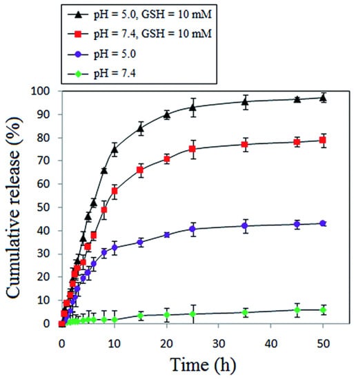 Li et al. [] designed an injectable hydrogel, poly(ethylene glycol)-b-poly(ε-caprolactone-co-1,4,8-trioxa[4.6]spiro-9-undecanone) that can be triggered by GSH to locally deliver PTX into tumor sites. In the presence of GSH, about 70% PTX was released at pH (7.4) and only 40% without GSH. A similar trend of drug release was reported by Niknejab et al. []. The report demonstrated that amphiphilic polymer can be designed to be both pH- and redox-responsive towards drug release. Here, they synthesized a PTX-conjugated PCL-based amphiphilic polymer to release the covalently attached PTX in the presence of GSH. About 97% and 79% of PTX were released at pH of 5.0 and 7.4 in the presence of GSH but close to 40% and 5% at pH of 5.0 and 7.4, respectively, in the absence of GSH (Figure 18). A similar observation was reported by Yin et al. [] where three amphiphilic polymers, mPEG-b-P(CL40-co-BCCL15) (PBCCL), mPEG-b-P(CL40-co-CCL15) (PCCL) and mPEG-b-P(CL40-co-CCL15)-g-PBA (PPBA), and the effect of the presence of hydrogen peroxide (ROS) on the release of DOX from the PPBA micelle was determined. Interestingly, this polymer was both pH and redox responsive as 50% DOX was released at a pH of 5.5 and only 10% at a pH of 7.4. In the presence of radicals (hydrogen peroxide), a relatively higher amount of DOX was released at all pH, with the highest at the pH of 5.5. This indicates that amphiphilic polymers can be designed to possess multiple stimuli-responsive behaviors to release both covalently attached and encapsulated drugs.