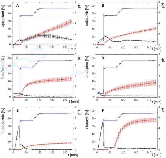 Biphasic dissolution profiles; black: drug concentration in aqueous phase; red: drug concentration in organic phase; blue: pH; (A) aprepitant; (B) celecoxib, (C) fenofibrate (new data); (D) nimodipine; (E) itraconazole; (F) ritonavir. Adapted with permission from Denninger et al., Shared IVIVR for Five Commercial Enabling Formulations using the BiPHa+ Biphasic Dissolution Assay; Pharmaceutics., 2021 [].