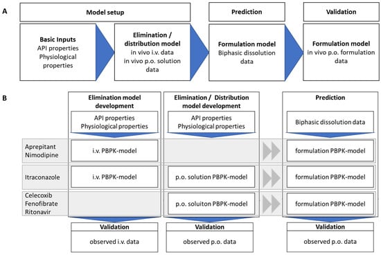 Workflow of PBPK-model development (A) and prediction of different drugs and their validation with observed plasma concentration time profiles from Phase 1 ADME studies. (B) Applied models for the different APIs depending on available literature data (details can be found in Section 2.4.1, Section 2.4.2, Section 2.4.3, Section 2.4.4, Section 2.4.5 and Section 2.4.6).