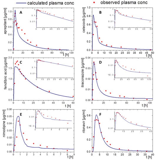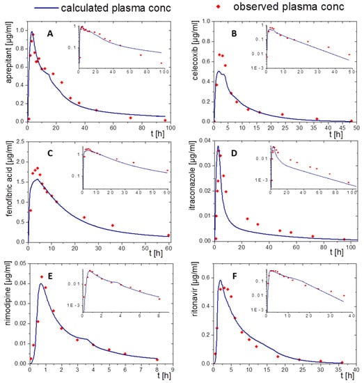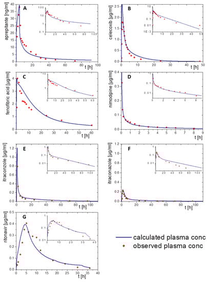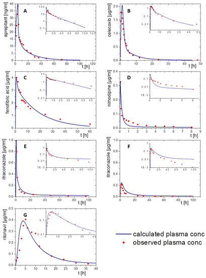 Simulated plasma concentration time profile using GastroPlus® (blue line) and observed pharmacokinetic data (red dots): (A) aprepitant after a 2 h infusion, (B) celecoxib following an oral solution, (C) fenofibrate administered as oral solution, (D) nimodipine administered by a single injection, (E) itraconazole after infusion of a cyclodextrin-based formulation, (F) itraconazole after oral administration of a solution formulation, and (G) ritonavir administered as oral solution.