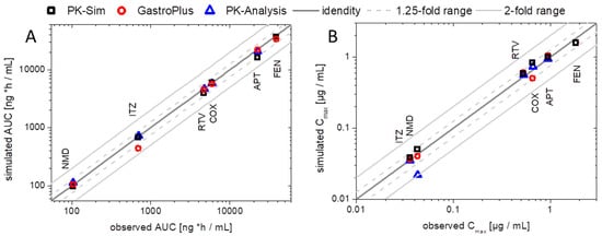 Verification of enabling formulation PBPK in GastroPlus® or PK-Sim and PK models [] including the biphasic dissolution profiles by comparing observed vs. predicted values: (A) AUC values and (B) Cmax values. The dark grey line represents the line of identical observed in vivo and predicted. The light grey solid lines represent the 2-fold, the light grey dotted lines the 1.25-fold boundary.