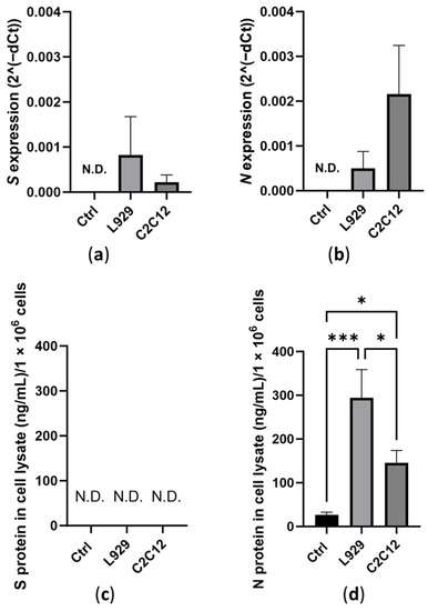 Expression of S and N 2 days after in vitro GET to L929 fibroblasts and C2C12 myoblasts: (a) S mRNA expression; (b) N mRNA expression; (c) concentration of S protein in cell lysate; and (d) concentration of N protein in cell lysate. Graph bars represent the mean with standard error of the mean (SEM) of three independent experiments with 3 technical replicates. Ctrl, non-transfected cells (nuclease-free water + EP); N.D., not detected. One-way ANOVA: *, p ≤ 0.05; and ***, p ≤ 0.001.