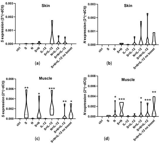 Expression of N and S in skin and muscle tissue 28 days after the first vaccine dose (in vivo GET): (a) S mRNA expression after skin transfection; (b) N mRNA expression after skin transfection; (c) S mRNA expression after muscle transfection; and (d) N mRNA expression after muscle transfection. Results are presented as violin plots showing data distribution. Total of 5–10 animals per group. Ctrl, non-treated mice. One-way ANOVA vs. Ctrl: *, p ≤ 0.05; **, p ≤ 0.01; and ***, p ≤ 0.001.