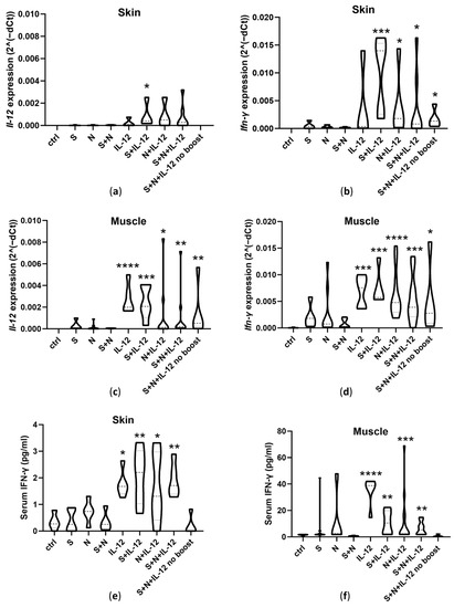 Expression of Il-12 and Ifn-γ in skin and muscle tissue and serum IFN-γ concentrations 28 days after the first vaccine dose (in vivo GET): (a) Il-12 mRNA expression after skin transfection; (b) Ifn-γ mRNA expression after skin transfection; (c) Il-12 mRNA expression after muscle transfection; (d) Ifn-γ mRNA expression after muscle transfection; (e) serum IFN-γ protein concentrations after skin transfection; and (f) serum IFN-γ protein concentrations after muscle transfection. Results are presented as violin plots showing data distribution. Total of 5–10 animals per group. Ctrl, non-treated mice. One-way ANOVA vs. Ctrl: *, p ≤ 0.05; **, p ≤ 0.01; ***, p ≤ 0.001; and ****, p ≤ 0.0001.