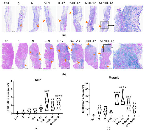 Immune infiltration at the vaccination sites 28 days after the first vaccine dose: (a) hematoxylin and eosin stained skin tissue slides; (b) hematoxylin and eosin stained muscle tissue slides; (c) infiltration area in the skin samples; and (d) infiltration area in the muscle samples. Arrows indicate immune infiltration. Scale bar, 300 nm. Results are presented as violin plots showing data distribution. Total of 5–10 animals per group. Ctrl, non-treated mice. One-way ANOVA vs. Ctrl: *, p ≤ 0.05; **, p ≤ 0.01; ***, p ≤ 0.001; and ****, p ≤ 0.0001.