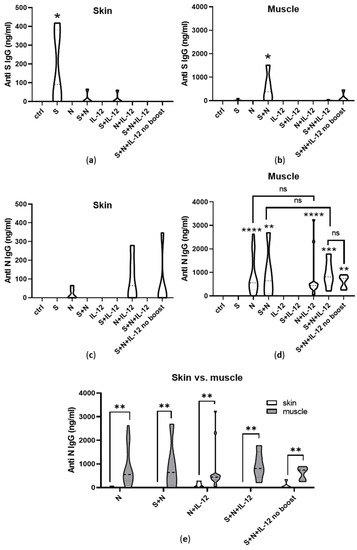 Induction of specific IgG antibodies against the transfected S and N antigens in the blood serum of the vaccinated mice 28 days after the first vaccine dose: (a) concentration of anti-S IgG antibodies after skin vaccination; (b) concentration of anti-S IgG antibodies after muscle vaccination; (c) concentration of anti-N IgG antibodies after skin vaccination; (d) concentration of anti-N IgG antibodies after muscle vaccination; and (e) comparison of induction of anti-N antibodies between skin and muscle vaccination. Results are presented as violin plots showing data distribution. Total of 5–10 animals per group. Ctrl, non-treated mice. One-way ANOVA vs. Ctrl or between indicated groups in graph e: *, p ≤ 0.05; **, p ≤ 0.01; ***, p ≤ 0.001; and ****, p ≤ 0.0001. One-way ANOVA vs. all groups: ns, p ≥ 0.05.