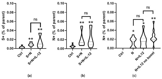 After vaccination in the muscle tissue, we also performed tests for cell-mediated immunity by determining antigen-specific cytotoxic T-cells against the transfected S and N antigens in the spleens of the vaccinated mice. The first experiment was performed on main therapeutic groups using both plasmids, and the second experiment was performed using only the plasmid for N. The results of the first experiment confirmed that vaccination led to the induction of N as well as S-specific cytotoxic T-cells (Figure 6a,b). The second experiment confirmed the induction of N-specific antibodies also when the pN plasmid was used alone and in combination with IL-12 (Figure 6c). Again, the addition of the adjuvant did not lead to a significantly higher amount of N-specific T-cells, and the induction was also not significantly lower without the boost.