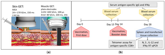 (a) Skin and muscle vaccination using GET; (b) timeline of the in vivo experiments.