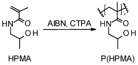 A dry 100 mL flask was loaded with a solution of HPMA (1 g, 7.0 mmol), AIBN (2.1 mg, 0.013 mmol) and CTPA (7.0 mg, 0.025 mmol) in ethanol (9 mL), and HCl (5 M, 50 μL) was added under argon atmosphere (Figure 4). The resulting pink solution was heated at 60 °C for 16 h. The crude product was precipitated by the addition of excess ethyl acetate under vigorous stirring. The pinkish precipitate was purified by centrifugation/redispersion in ethyl acetate (twice, 10 min, 5000 rpm) and dried. Yield: 0.690 g of P(HPMA). For the polymer’s characteristics, see Table 2.
