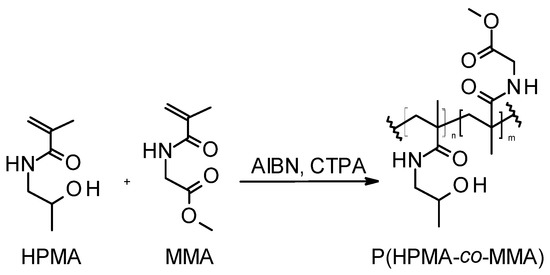 Eventually, HPMA (0.9 g, 6.3 mmol) and MMA (0.1 g, 0.70 mmol) were used as comonomers (Figure 5). Yield: 0.675 g of P(HPMA-co-MMA). For characterization data, see Table 2.