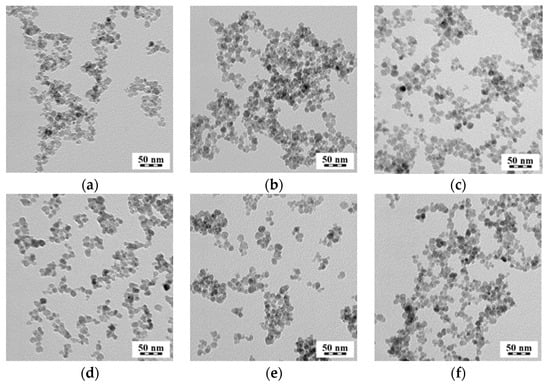 Comparison of TEM micrographs of (a) γ-Fe2O3⨁, (b) γ-Fe2O3⊖, (c) γ-Fe2O3⨁@P(HPMA-co-HAO), (d) γ-Fe2O3⊖@P(HPMA-co-HAO), (e) γ-Fe2O3⨁@P(HPMA-co-HAM), and (f) γ-Fe2O3⊖@P(HPMA-co-HAM).