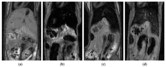 A dose of 18 µL of the suspension of nanoparticles (γ-Fe2O3⨁/⊖, γ-Fe2O3⨁/⊖@P(HPMA-co-HAO), with a concentration of 4.4 mg/mL of Fe2O3, i.e., 3.08 mg/mL of Fe) was mixed with 18 µL of saline solution and injected through the tail vein into the experimental mice (animal weight at the time of injection was 16 g). The dose of 55.4 µg Fe/mouse corresponded to 3.47 g Fe/kg of body weight; an equivalent human dosage would be 0.282 mg Fe/kg in humans, when normalized for body surface area [72]. The dosage was within the recommended interval of 0.2–0.8 mg Fe/kg [73] in humans, and did not exceed the FDA-recommended dose of ferucarbotran (0.56 mg Fe/kg). Each nanoparticle type was injected into four mice. The mice were scanned using an ICON MRI scanner (Bruker, Ettlingen, Germany) working at 1 T. The scanning protocol consisted of a fast gradient echo sequence in three anatomical directions for localization (echo time TE = 3 ms, repetition time TR = 107 ms, flip angle FA = 30°), an anatomical gradient echo sequence with mixed T1–T2* weighting (TE = 4 ms, TR = 160 ms, FA = 80°), and a strongly T2*-weighted gradient echo sequence (TE = 8 ms, TR = 400 ms, FA = 60°). The latter two sequences were in a coronal direction; FOV = 50 × 25 mm2 covered most of the mouse’s body, and the matrix was 256 × 128.